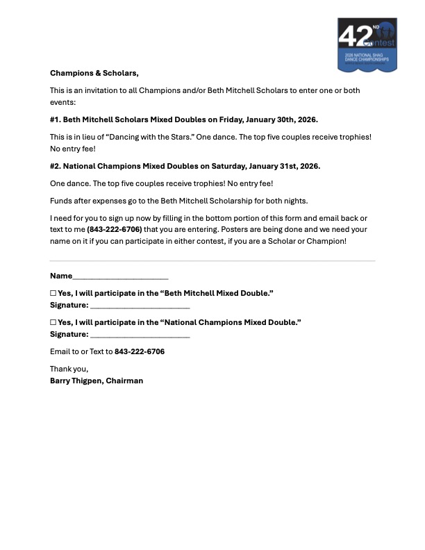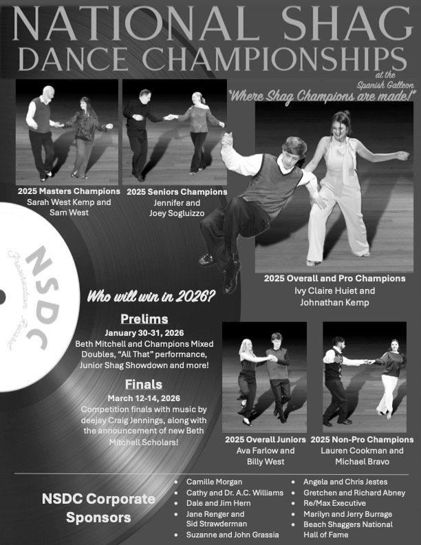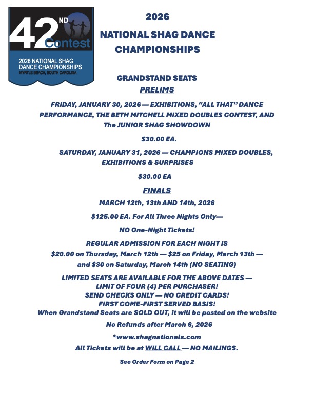 Friday Jan 30th – Special Guest Perfomance by “All That”, Beth Mitchell Scholars Mixed Doubles featuring past scholarship winners, and Junior Shaggers SHAG SHOWDOWN contest (sign up online for FREE at the link below) ; doors open at 7pm and contest starts at 8pm; $15 at the door or $30 Grandstand Seating info below.